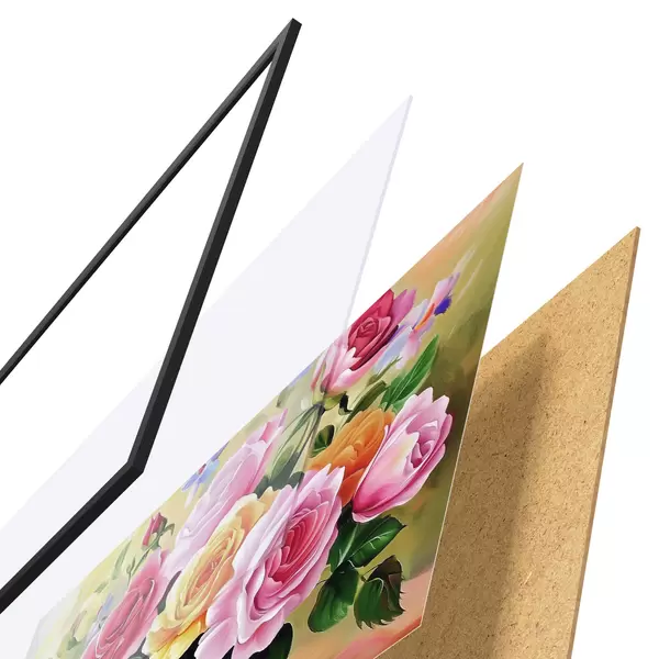 El póster consta de marco, plexiglás, imagen impresa y soporte de aglomerado. El póster puede colgarse inmediatamente en la pared gracias a los soportes de la parte posterior.