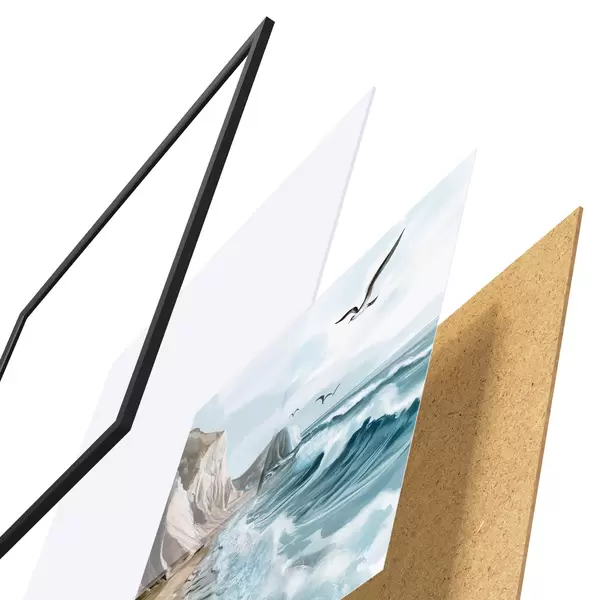 El póster consta de marco, plexiglás, imagen impresa y soporte de aglomerado. El póster puede colgarse inmediatamente en la pared gracias a los soportes de la parte posterior.