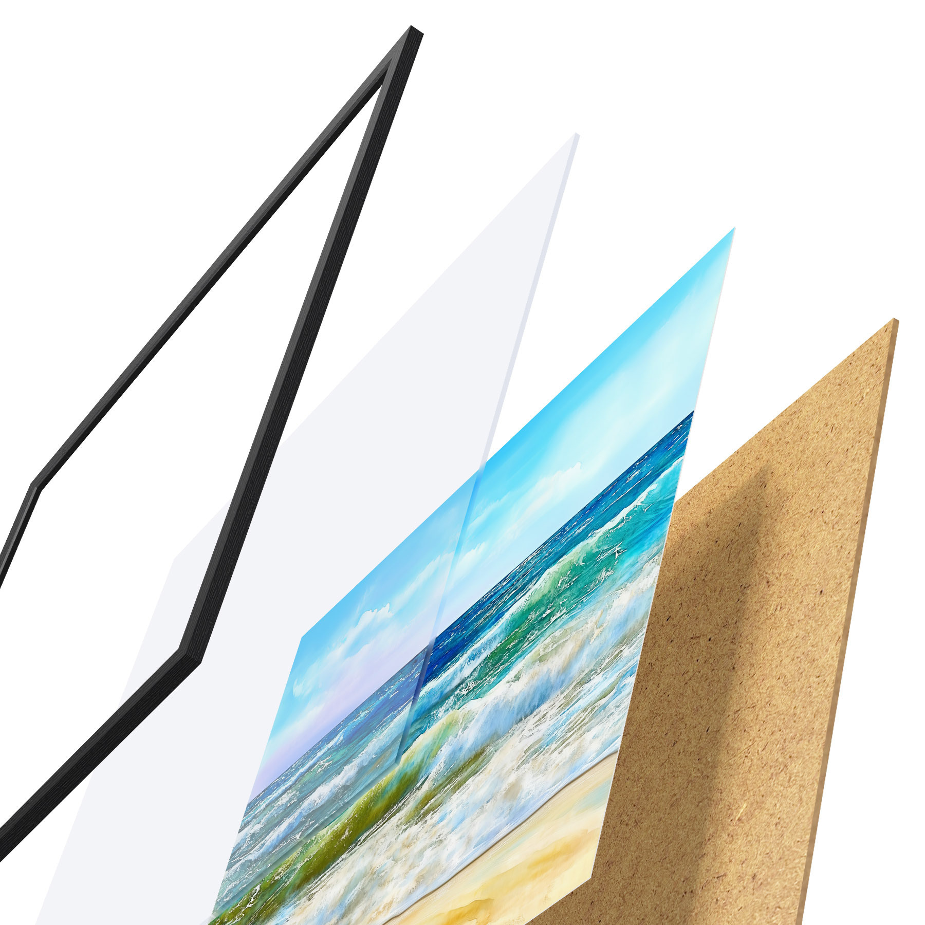 El póster consta de marco, plexiglás, imagen impresa y soporte de aglomerado. El póster puede colgarse inmediatamente en la pared gracias a los soportes de la parte posterior.