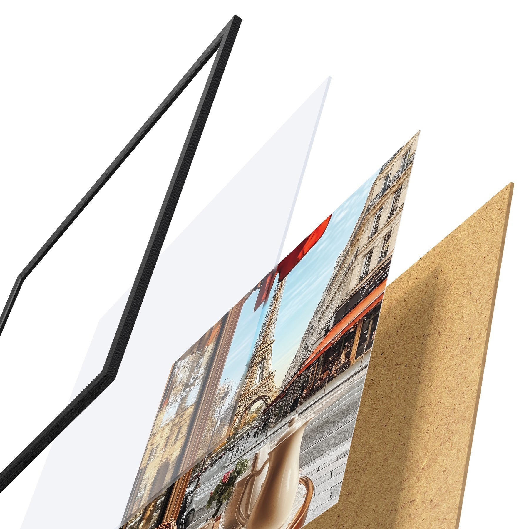 El póster consta de marco, plexiglás, imagen impresa y soporte de aglomerado. El póster puede colgarse inmediatamente en la pared gracias a los soportes de la parte posterior.