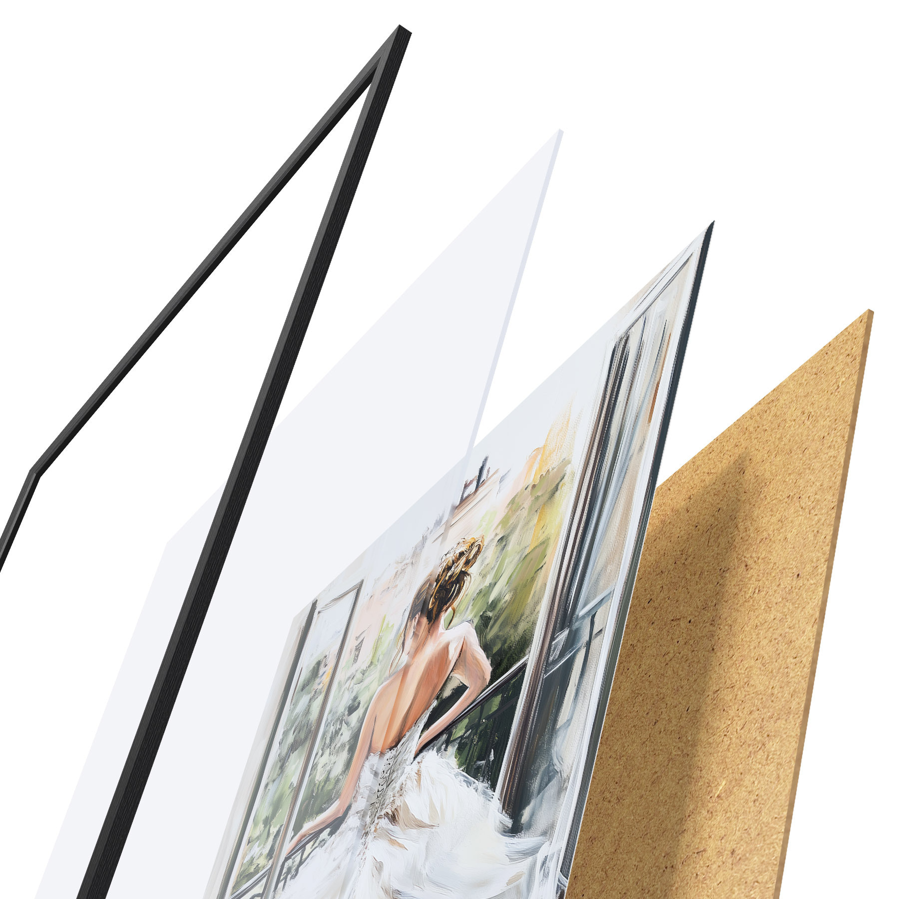 El póster consta de marco, plexiglás, imagen impresa y soporte de aglomerado. El póster puede colgarse inmediatamente en la pared gracias a los soportes de la parte posterior.