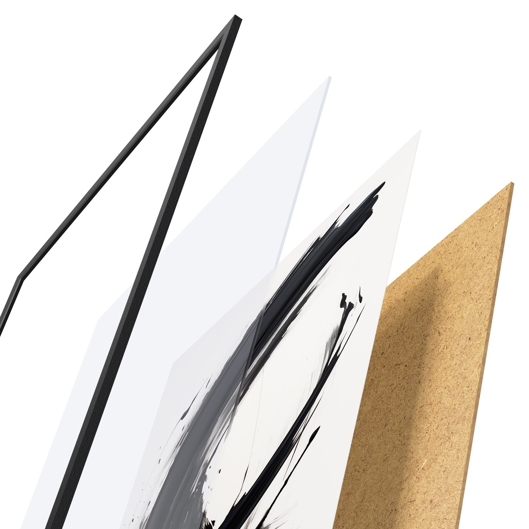 El póster consta de marco, plexiglás, imagen impresa y soporte de aglomerado. El póster puede colgarse inmediatamente en la pared gracias a los soportes de la parte posterior.