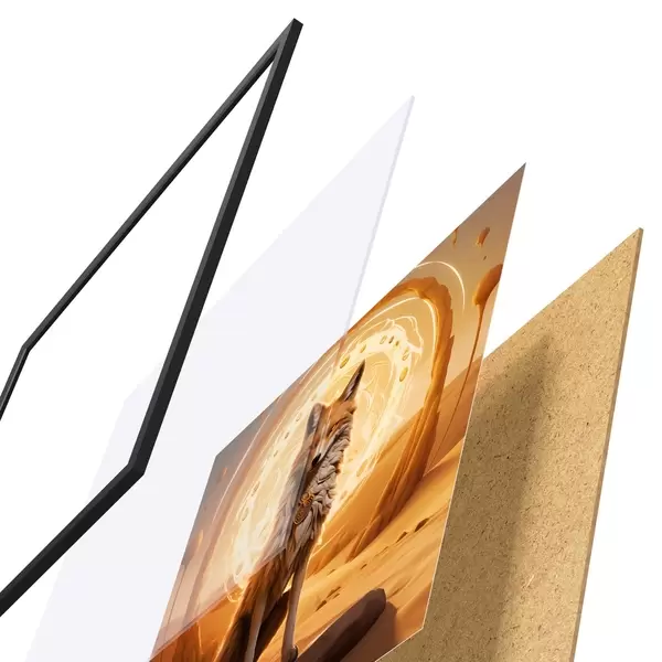 El póster consta de marco, plexiglás, imagen impresa y soporte de aglomerado. El póster puede colgarse inmediatamente en la pared gracias a los soportes de la parte posterior.