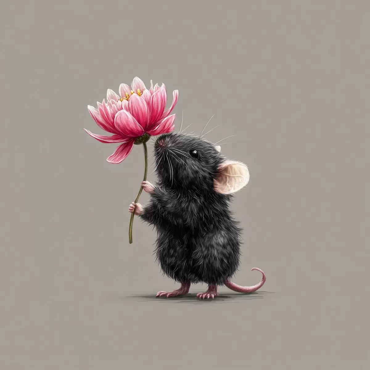 Poster Encantador ratón inhalando el aroma de una peonía rosa f44248