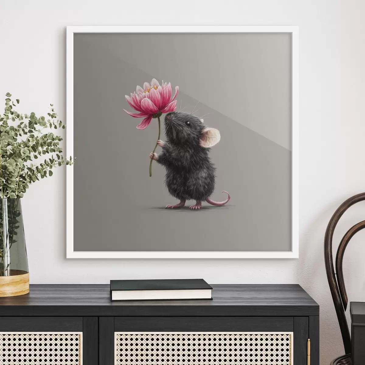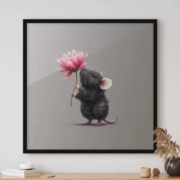 Poster Encantador ratón inhalando el aroma de una peonía rosa Nr f44248