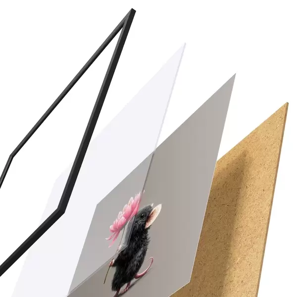 El póster consta de marco, plexiglás, imagen impresa y soporte de aglomerado. El póster puede colgarse inmediatamente en la pared gracias a los soportes de la parte posterior.