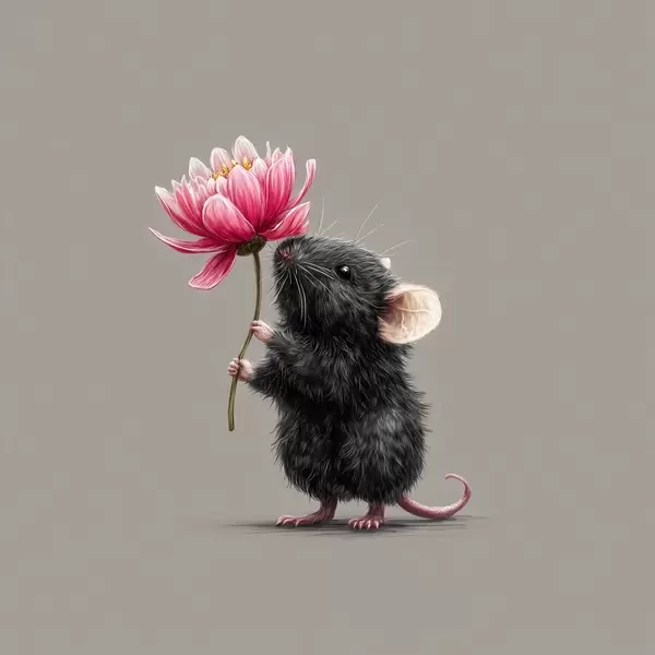 Poster Encantador ratón inhalando el aroma de una peonía rosa f44248