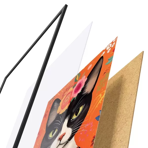 El póster consta de marco, plexiglás, imagen impresa y soporte de aglomerado. El póster puede colgarse inmediatamente en la pared gracias a los soportes de la parte posterior.