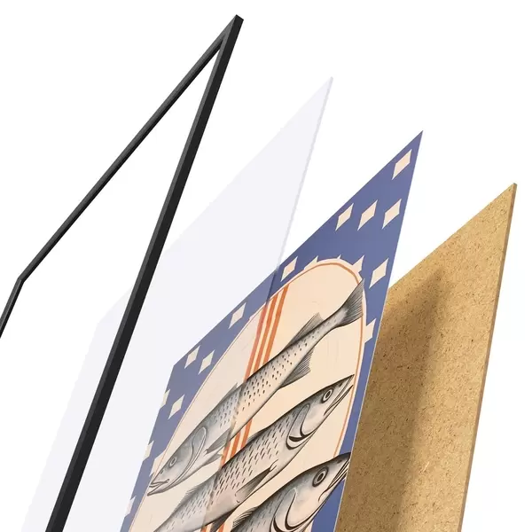 El póster consta de marco, plexiglás, imagen impresa y soporte de aglomerado. El póster puede colgarse inmediatamente en la pared gracias a los soportes de la parte posterior.