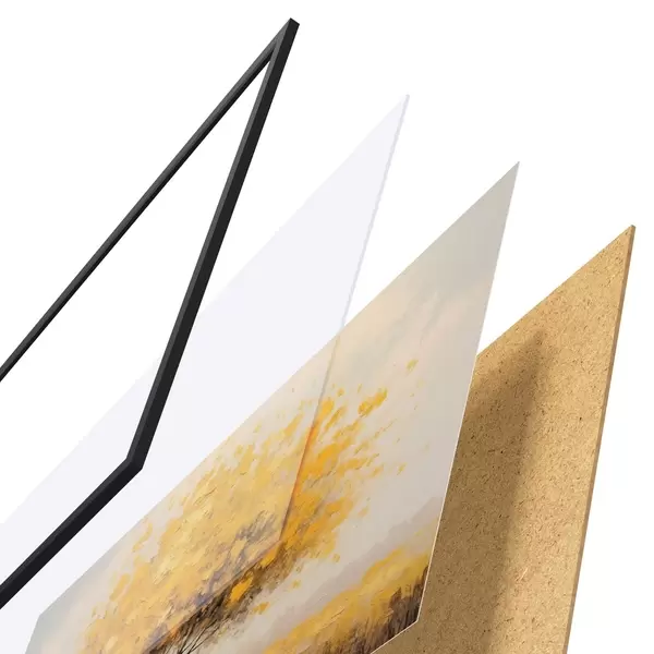 El póster consta de marco, plexiglás, imagen impresa y soporte de aglomerado. El póster puede colgarse inmediatamente en la pared gracias a los soportes de la parte posterior.