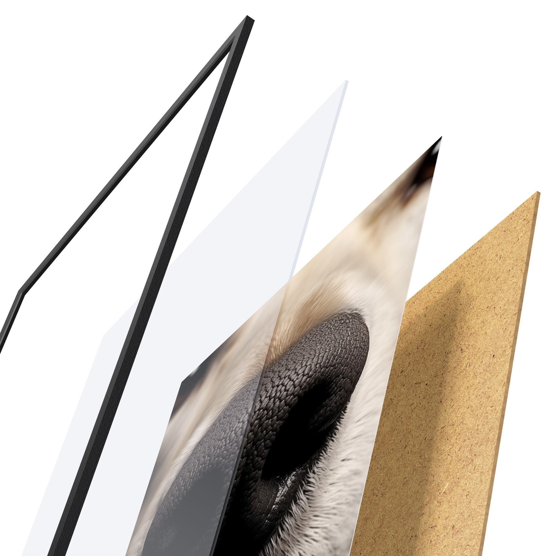 El póster consta de marco, plexiglás, imagen impresa y soporte de aglomerado. El póster puede colgarse inmediatamente en la pared gracias a los soportes de la parte posterior.
