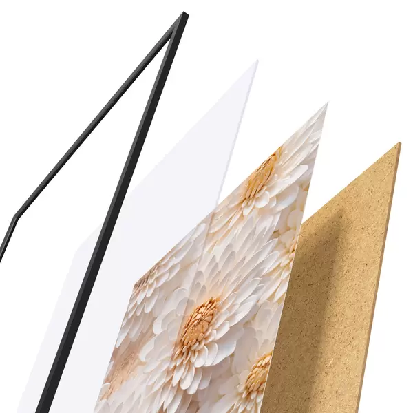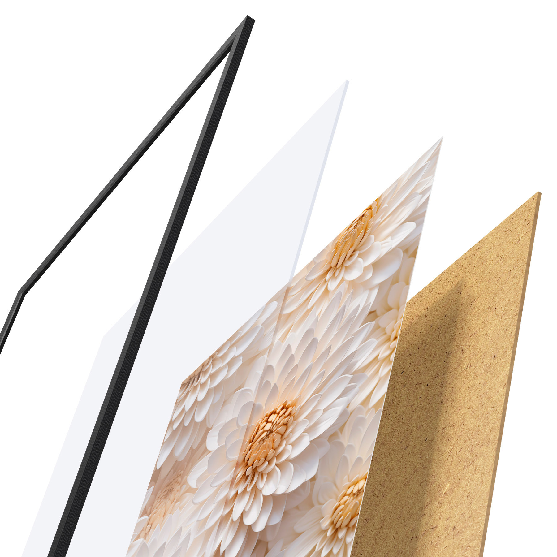El póster consta de marco, plexiglás, imagen impresa y soporte de aglomerado. El póster puede colgarse inmediatamente en la pared gracias a los soportes de la parte posterior.