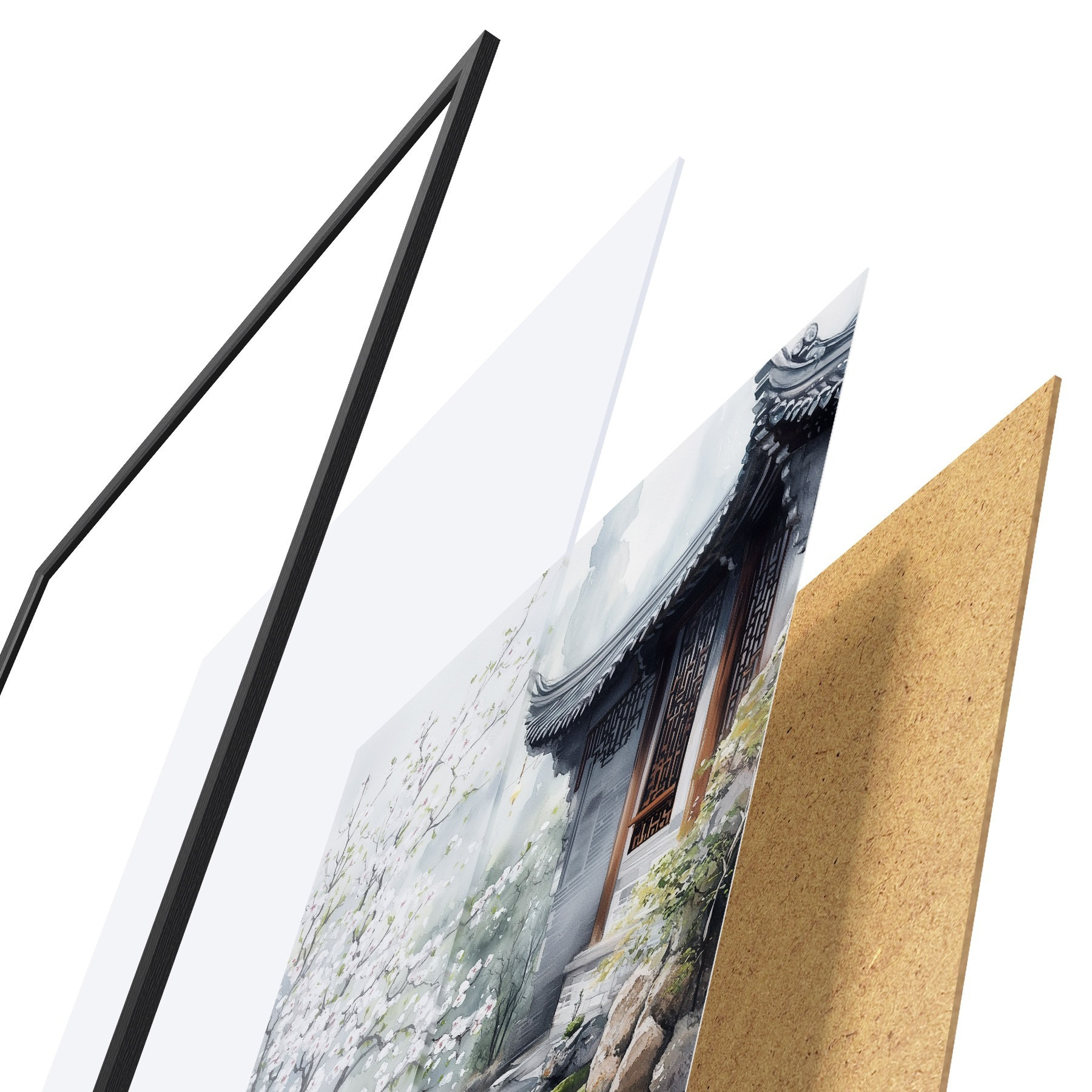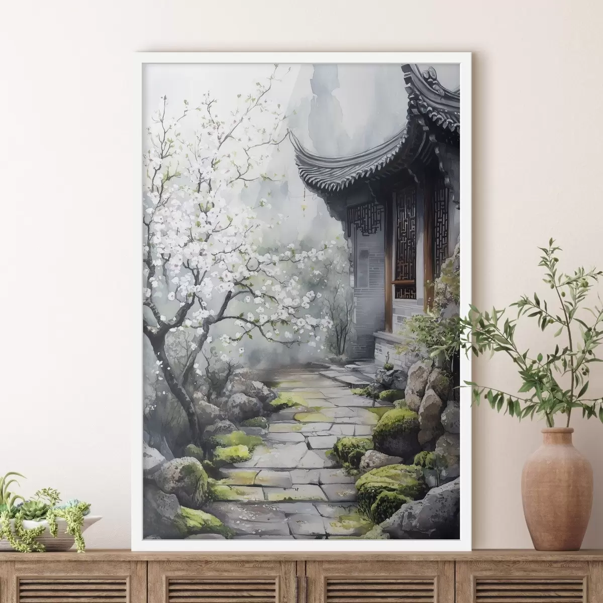 Poster Jardín japonés con cerezo y casa, estilo oriental, acuarela Nr f44309
