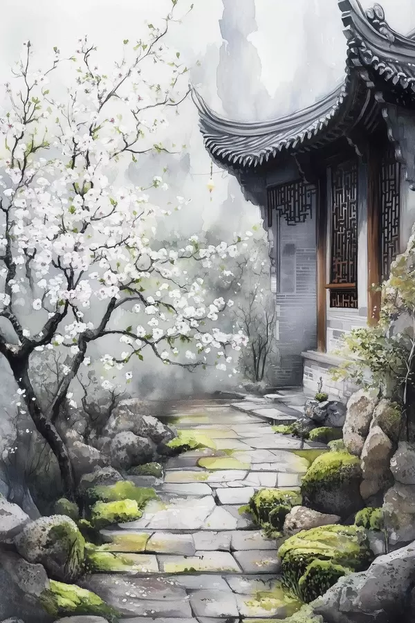 Poster Jardín japonés con cerezo y casa, estilo oriental, acuarela Nr f44309