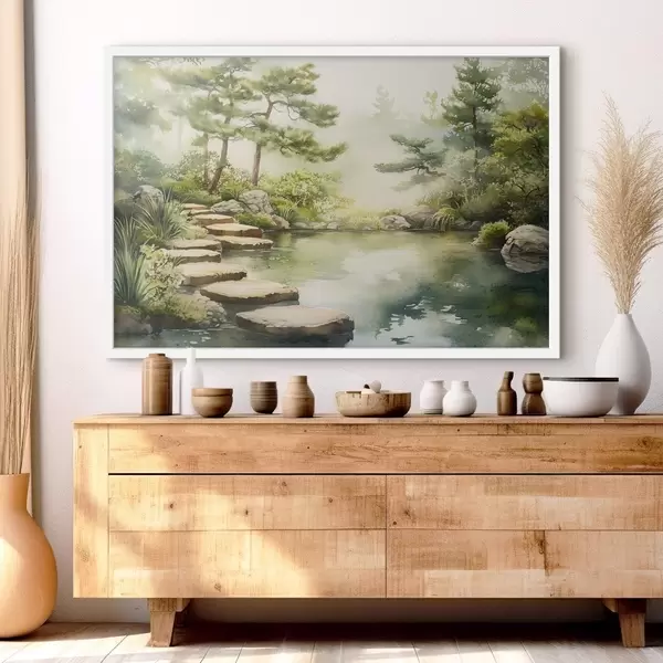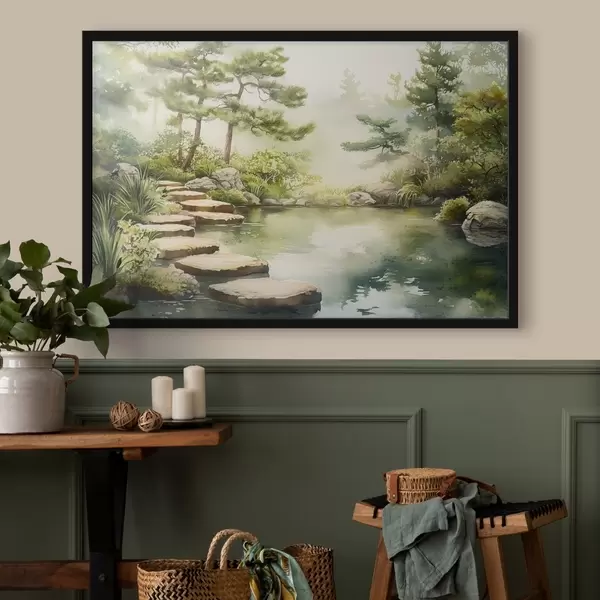 Poster Jardín oriental con lago y árboles, naturaleza, estilo acuarela Nr f44313