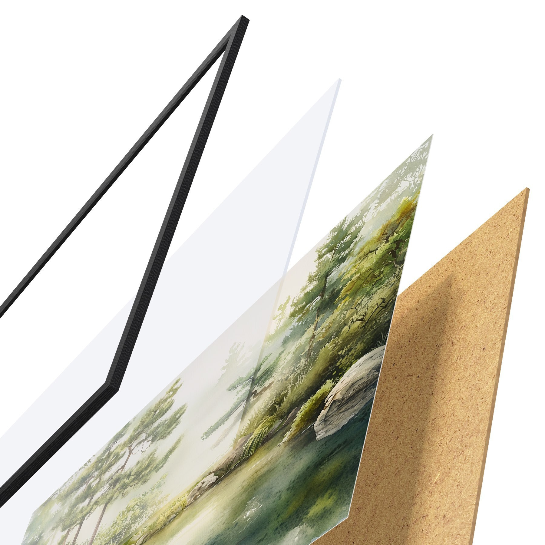 El póster consta de marco, plexiglás, imagen impresa y soporte de aglomerado. El póster puede colgarse inmediatamente en la pared gracias a los soportes de la parte posterior.