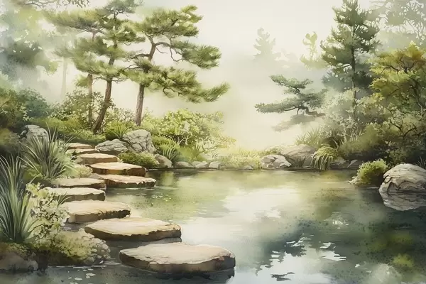 Poster Jardín oriental con lago y árboles, naturaleza, estilo acuarela Nr f44313