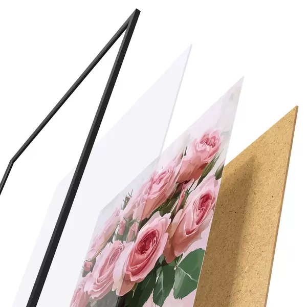 El póster consta de marco, plexiglás, imagen impresa y soporte de aglomerado. El póster puede colgarse inmediatamente en la pared gracias a los soportes de la parte posterior.