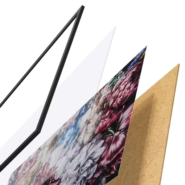 El póster consta de marco, plexiglás, imagen impresa y soporte de aglomerado. El póster puede colgarse inmediatamente en la pared gracias a los soportes de la parte posterior.