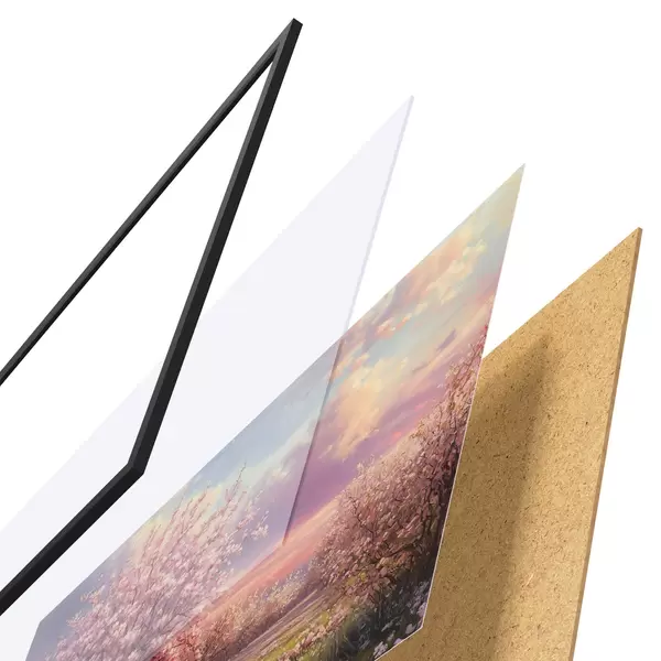 El póster consta de marco, plexiglás, imagen impresa y soporte de aglomerado. El póster puede colgarse inmediatamente en la pared gracias a los soportes de la parte posterior.