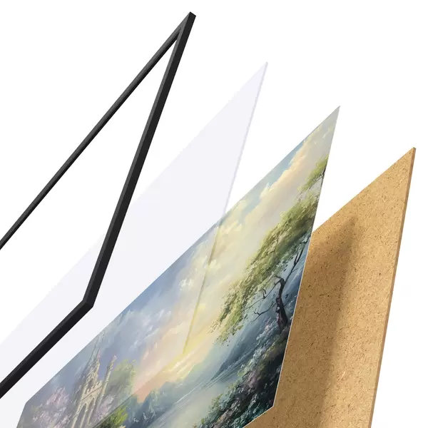 El póster consta de marco, plexiglás, imagen impresa y soporte de aglomerado. El póster puede colgarse inmediatamente en la pared gracias a los soportes de la parte posterior.