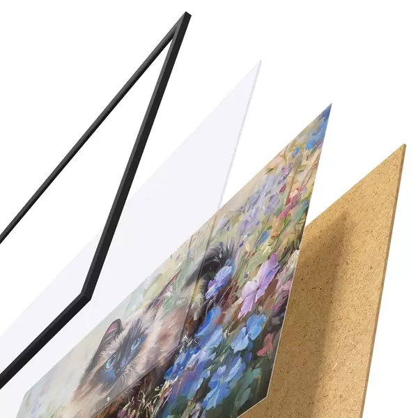 El póster consta de marco, plexiglás, imagen impresa y soporte de aglomerado. El póster puede colgarse inmediatamente en la pared gracias a los soportes de la parte posterior.