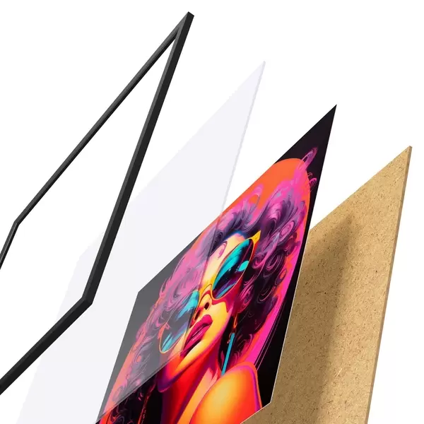 El póster consta de marco, plexiglás, imagen impresa y soporte de aglomerado. El póster puede colgarse inmediatamente en la pared gracias a los soportes de la parte posterior.