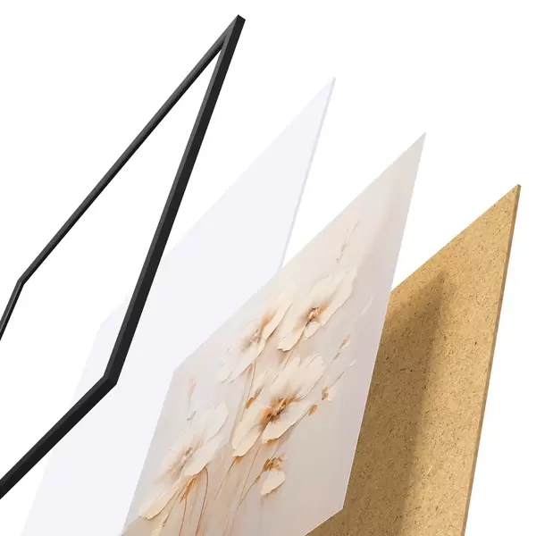 El póster consta de marco, plexiglás, imagen impresa y soporte de aglomerado. El póster puede colgarse inmediatamente en la pared gracias a los soportes de la parte posterior.