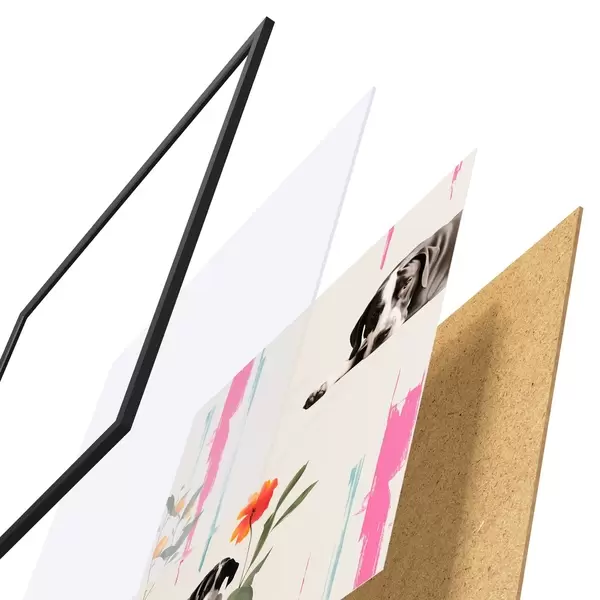 El póster consta de marco, plexiglás, imagen impresa y soporte de aglomerado. El póster puede colgarse inmediatamente en la pared gracias a los soportes de la parte posterior.