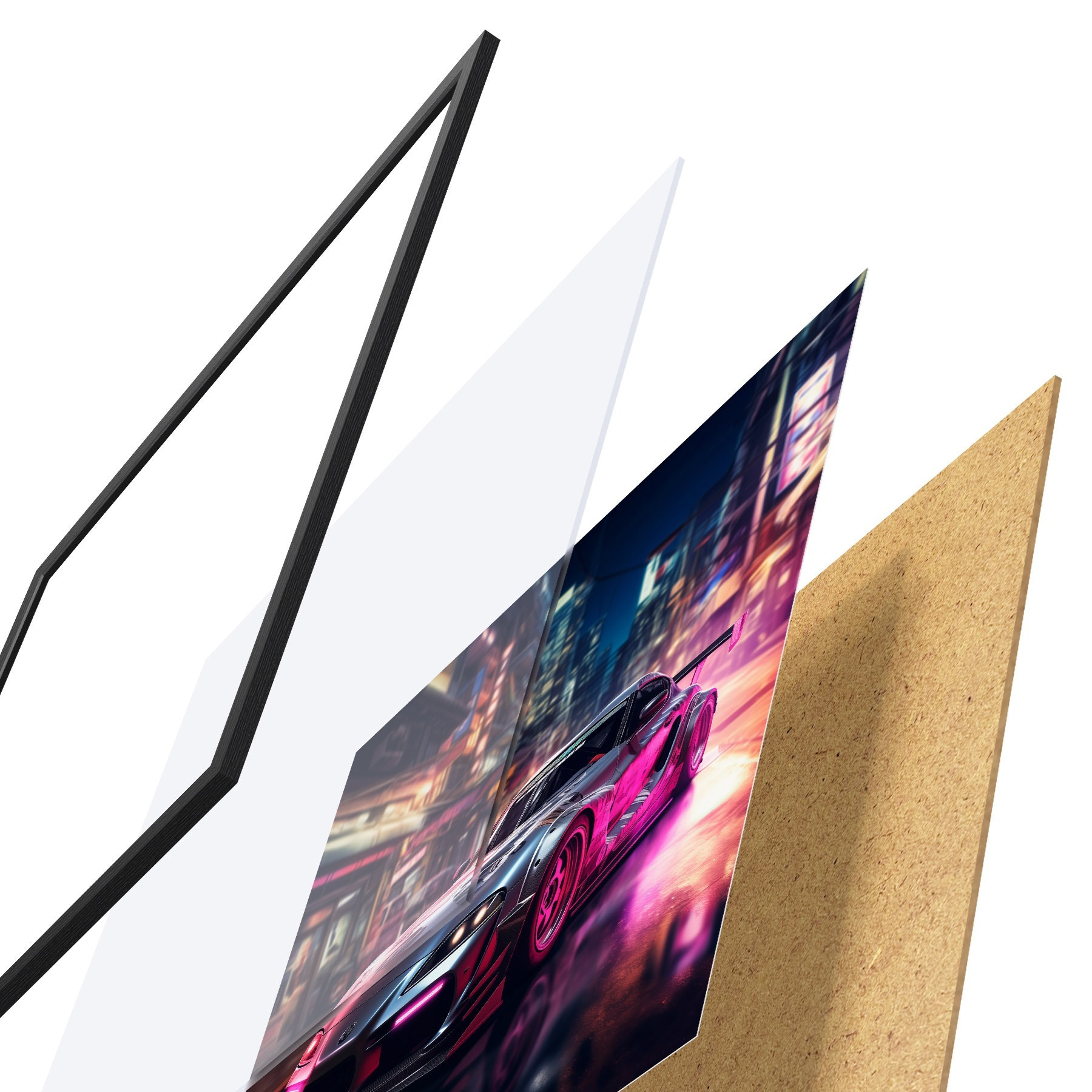 El póster consta de marco, plexiglás, imagen impresa y soporte de aglomerado. El póster puede colgarse inmediatamente en la pared gracias a los soportes de la parte posterior.