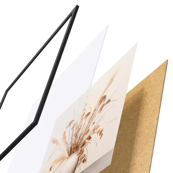 El póster consta de marco, plexiglás, imagen impresa y soporte de aglomerado. El póster puede colgarse inmediatamente en la pared gracias a los soportes de la parte posterior.