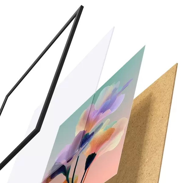 El póster consta de marco, plexiglás, imagen impresa y soporte de aglomerado. El póster puede colgarse inmediatamente en la pared gracias a los soportes de la parte posterior.