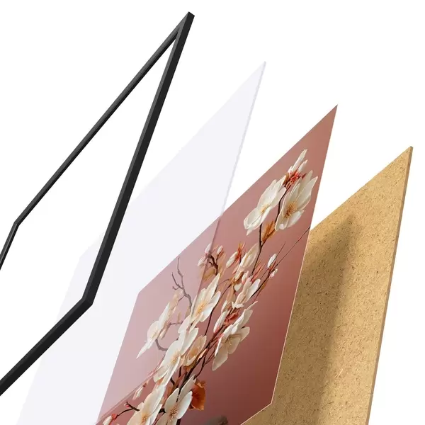 El póster consta de marco, plexiglás, imagen impresa y soporte de aglomerado. El póster puede colgarse inmediatamente en la pared gracias a los soportes de la parte posterior.