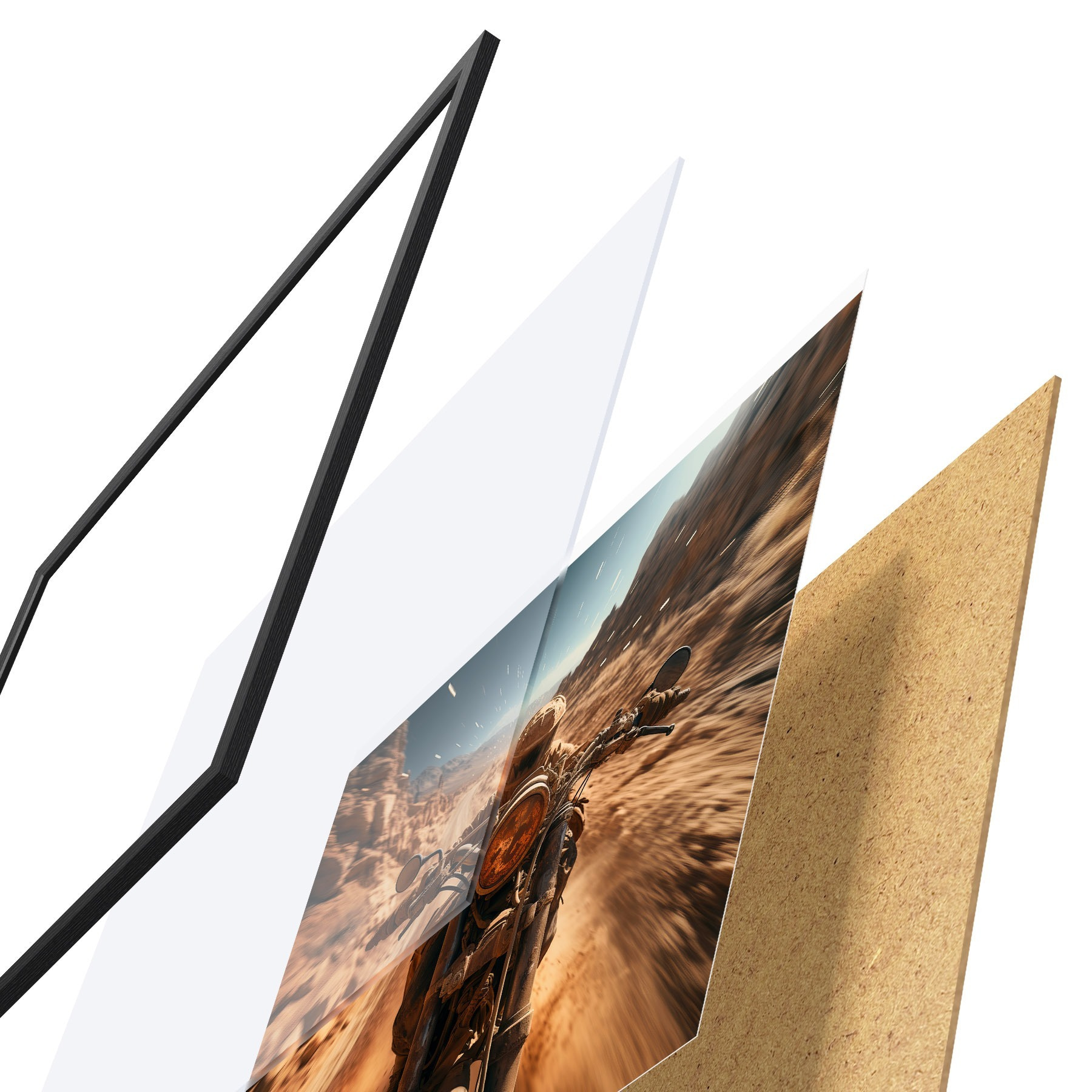 El póster consta de marco, plexiglás, imagen impresa y soporte de aglomerado. El póster puede colgarse inmediatamente en la pared gracias a los soportes de la parte posterior.