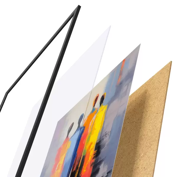 El póster consta de marco, plexiglás, imagen impresa y soporte de aglomerado. El póster puede colgarse inmediatamente en la pared gracias a los soportes de la parte posterior.