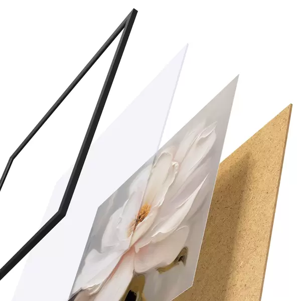 El póster consta de marco, plexiglás, imagen impresa y soporte de aglomerado. El póster puede colgarse inmediatamente en la pared gracias a los soportes de la parte posterior.