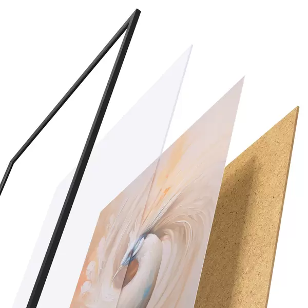 El póster consta de marco, plexiglás, imagen impresa y soporte de aglomerado. El póster puede colgarse inmediatamente en la pared gracias a los soportes de la parte posterior.
