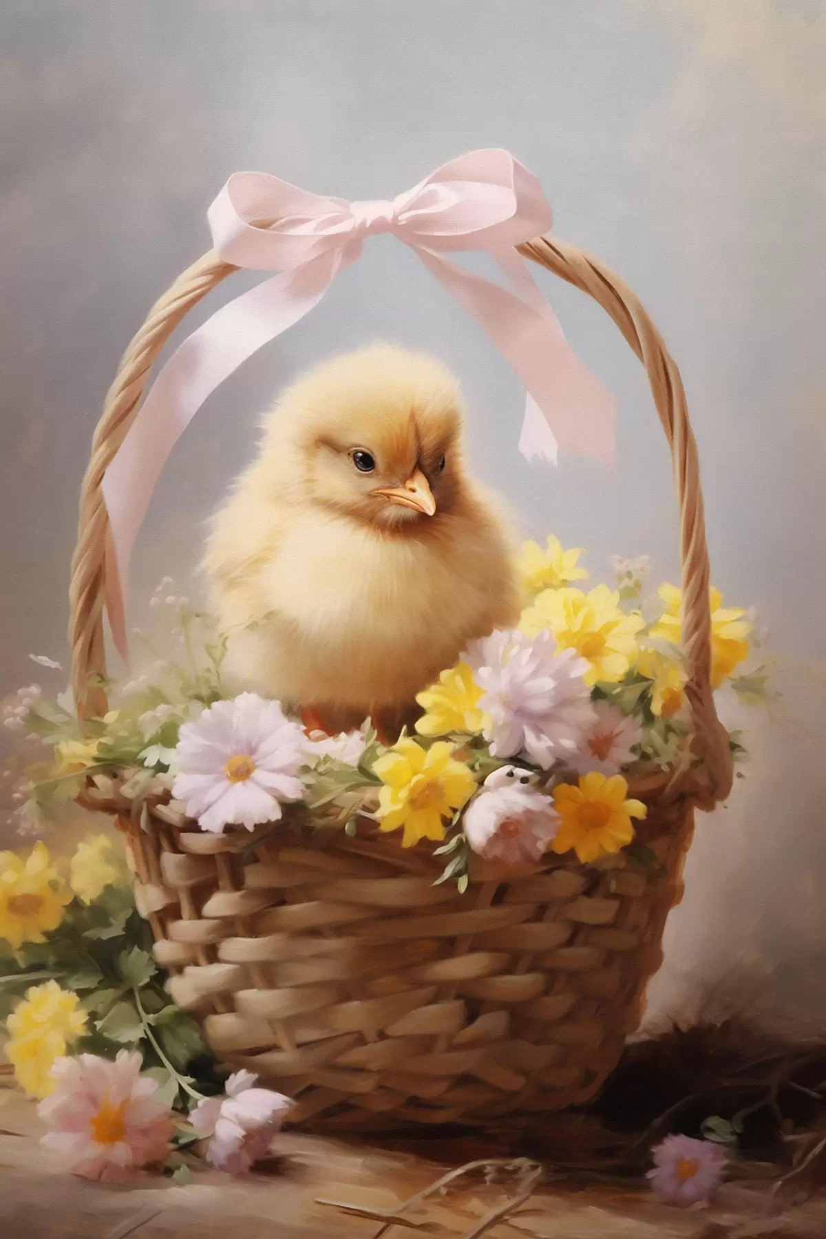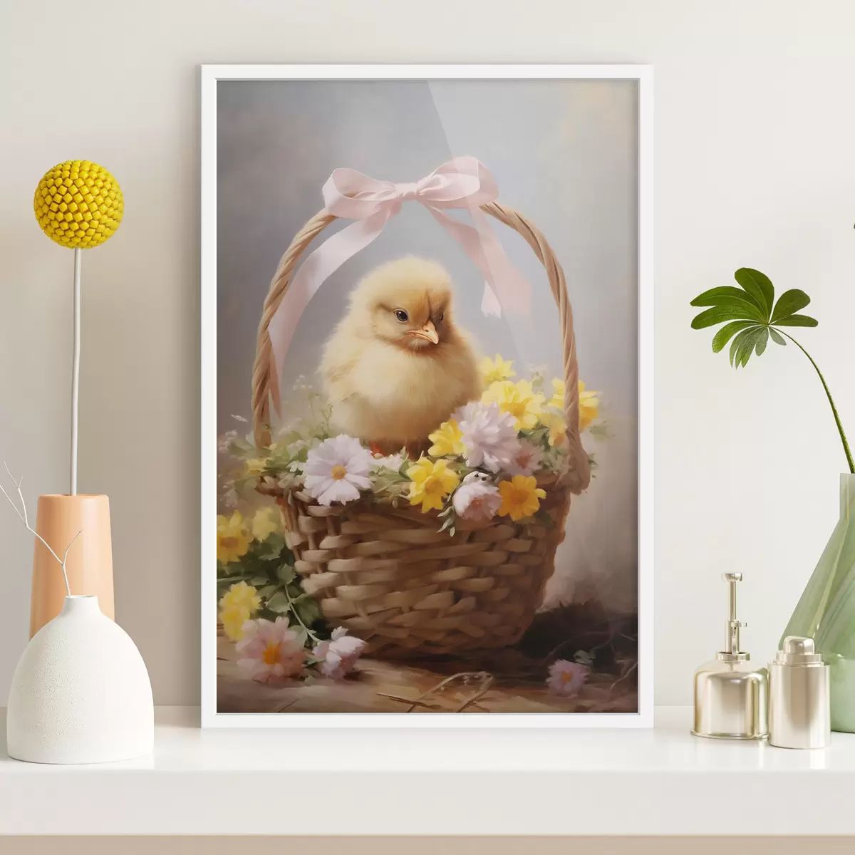 Poster Pollito amarillo en una cesta con flores silvestres Nr f44384