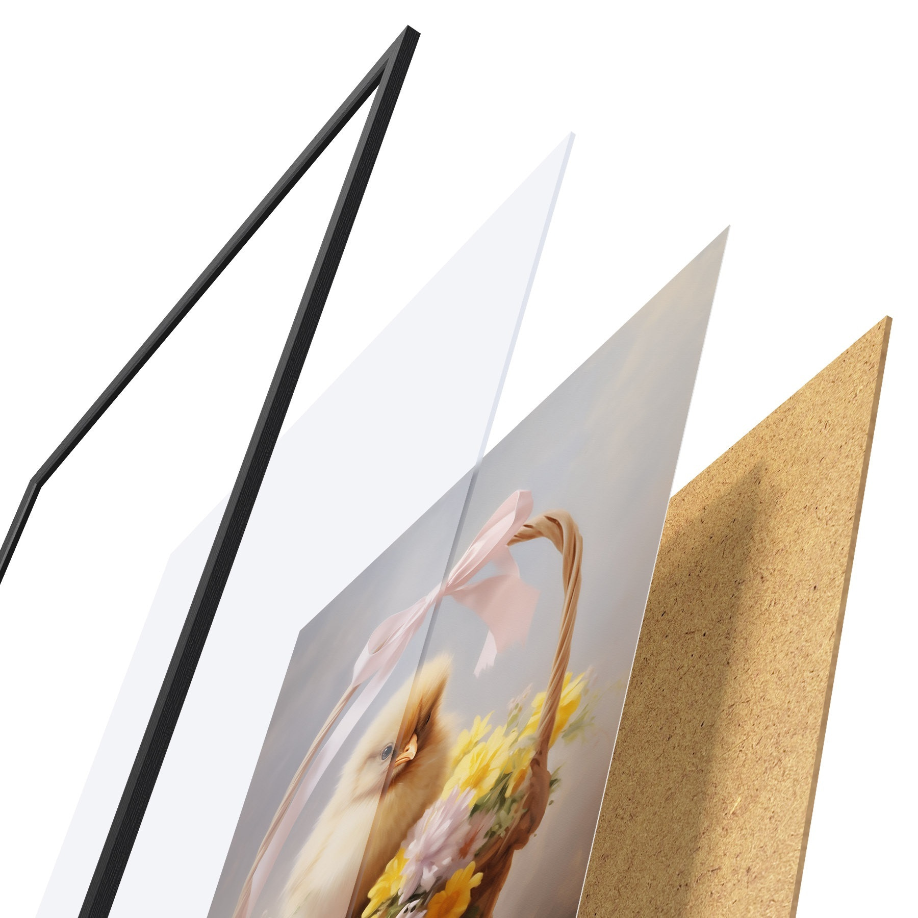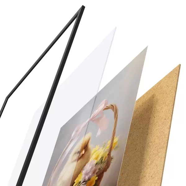El póster consta de marco, plexiglás, imagen impresa y soporte de aglomerado. El póster puede colgarse inmediatamente en la pared gracias a los soportes de la parte posterior.