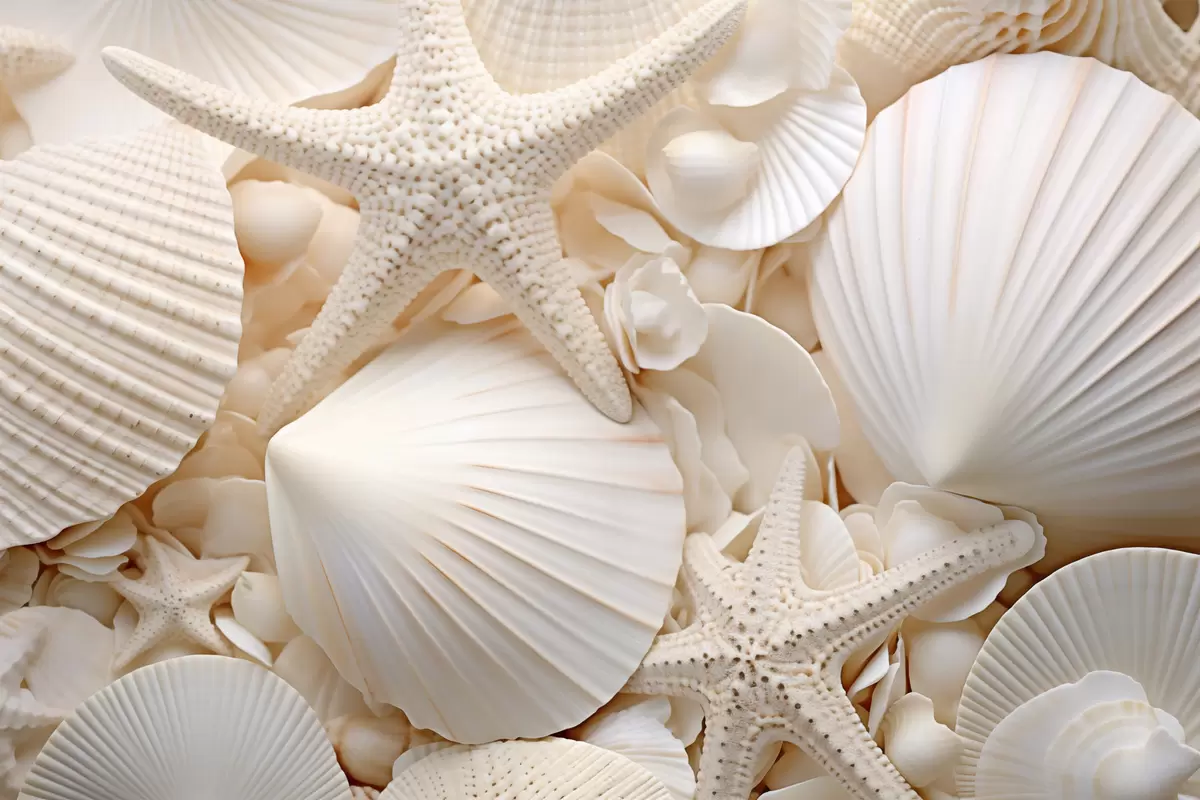 Poster Conchas y estrellas de mar blancas decorativas, que crean una composición monocromática con textura f44392