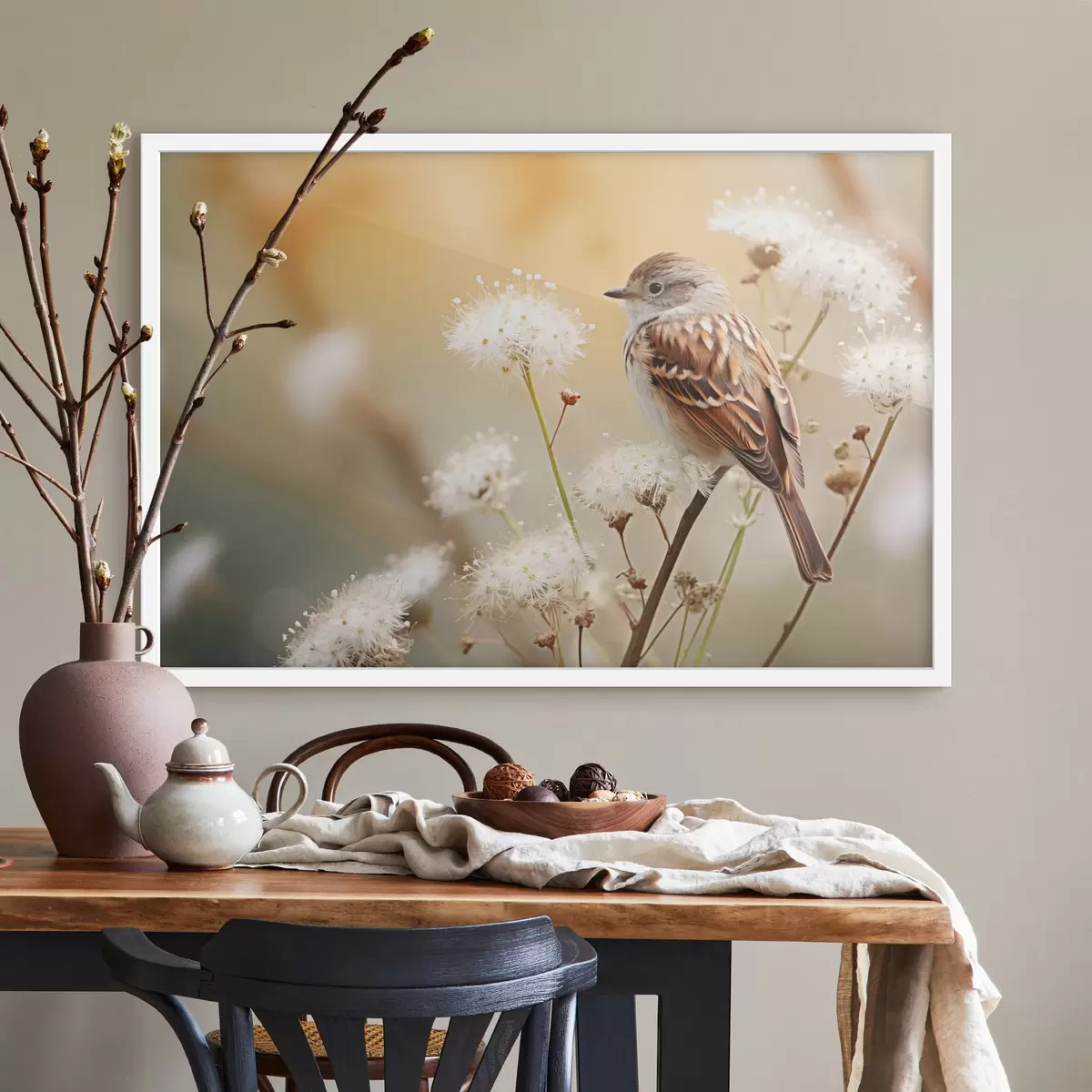 Poster Un pájaro posado en una rama con flores blancas, enfoque suave, fondo de naturaleza Nr f44393