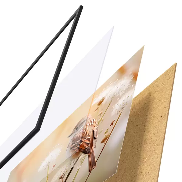 El póster consta de marco, plexiglás, imagen impresa y soporte de aglomerado. El póster puede colgarse inmediatamente en la pared gracias a los soportes de la parte posterior.