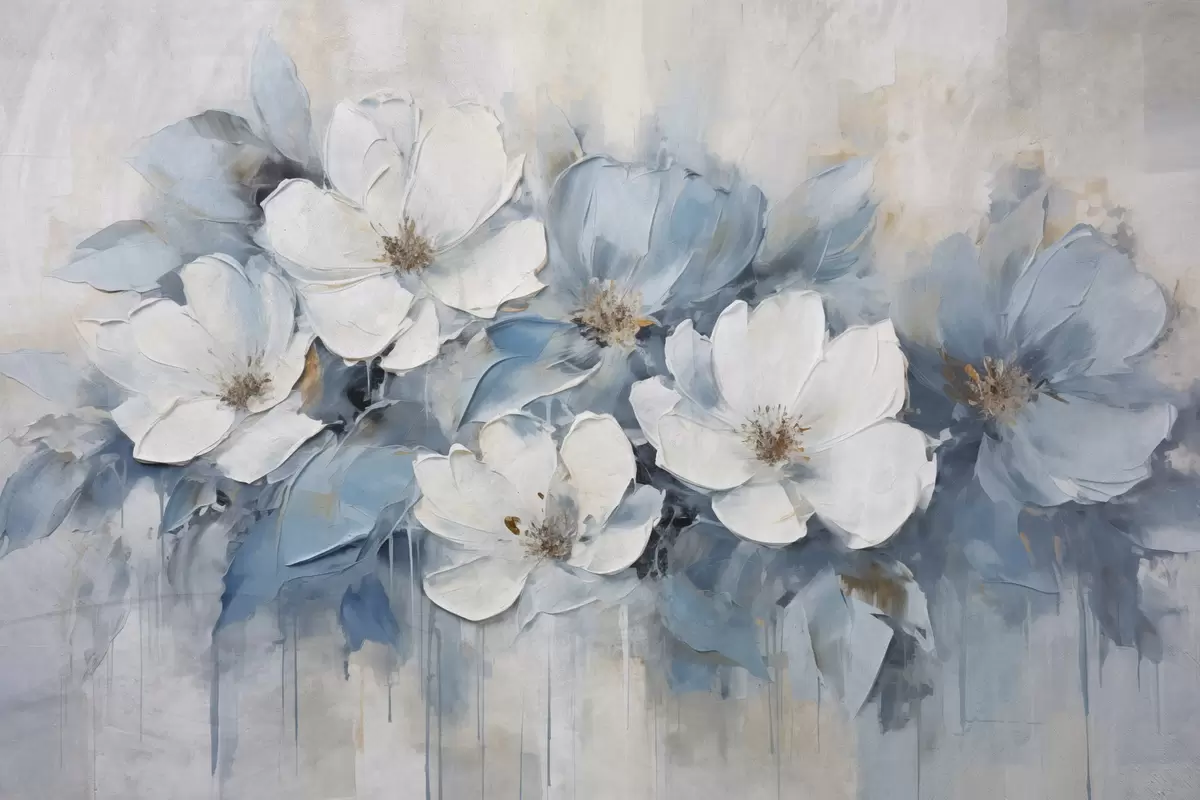 Poster Flores blancas con hojas azules, sobre fondo beige claro, con pinceladas visibles Nr f44395