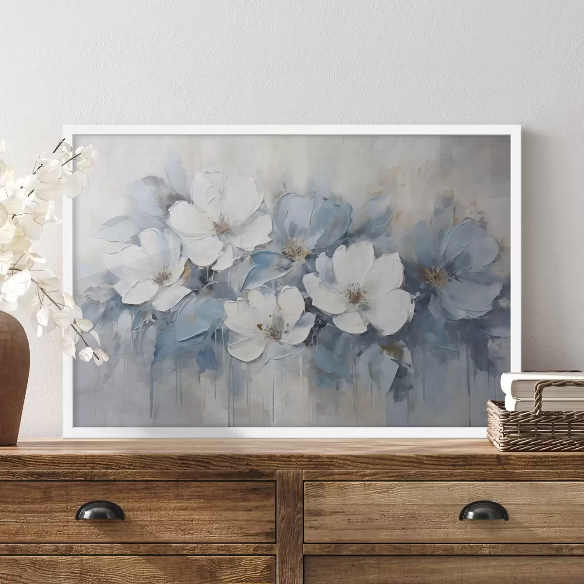 Poster Flores blancas con hojas azules, sobre fondo beige claro, con pinceladas visibles f44395