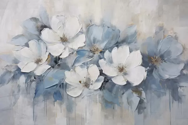 Poster Flores blancas con hojas azules, sobre fondo beige claro, con pinceladas visibles f44395