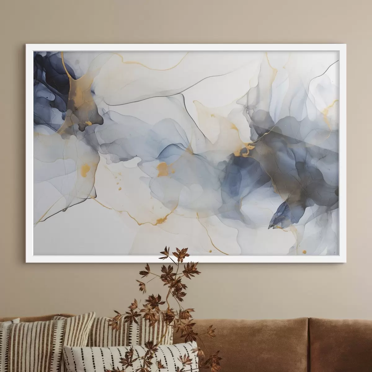 Poster Pintura abstracta con tinta azul, formas fluidas y orgánicas, texturas delicadas sobre fondo blanco Nr f44397