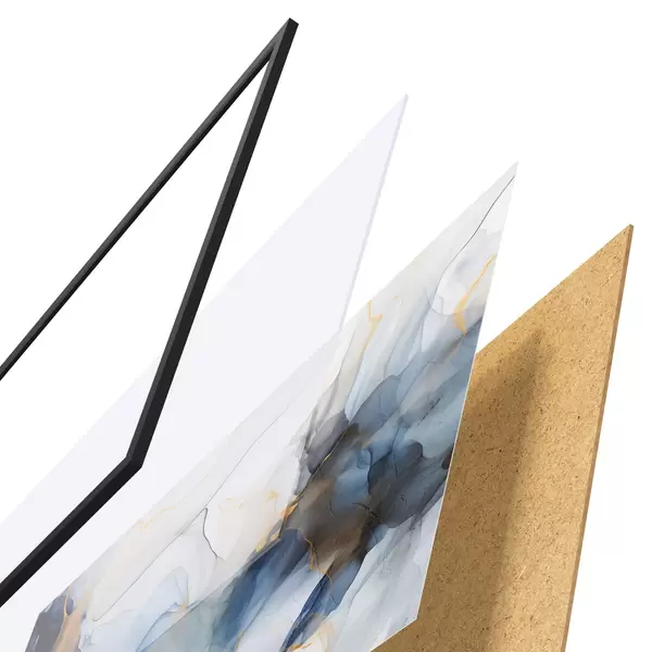El póster consta de marco, plexiglás, imagen impresa y soporte de aglomerado. El póster puede colgarse inmediatamente en la pared gracias a los soportes de la parte posterior.