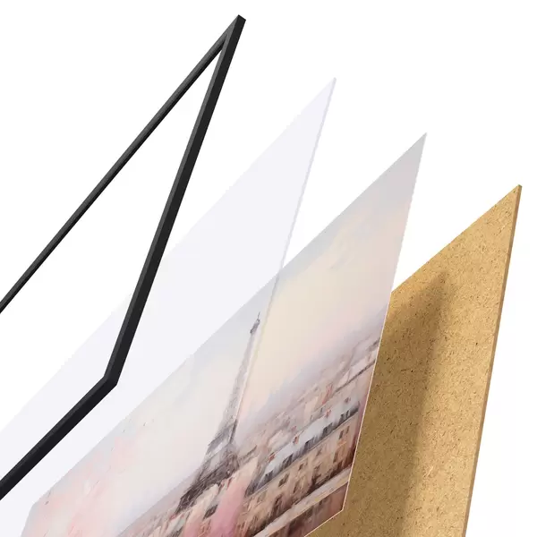 El póster consta de marco, plexiglás, imagen impresa y soporte de aglomerado. El póster puede colgarse inmediatamente en la pared gracias a los soportes de la parte posterior.