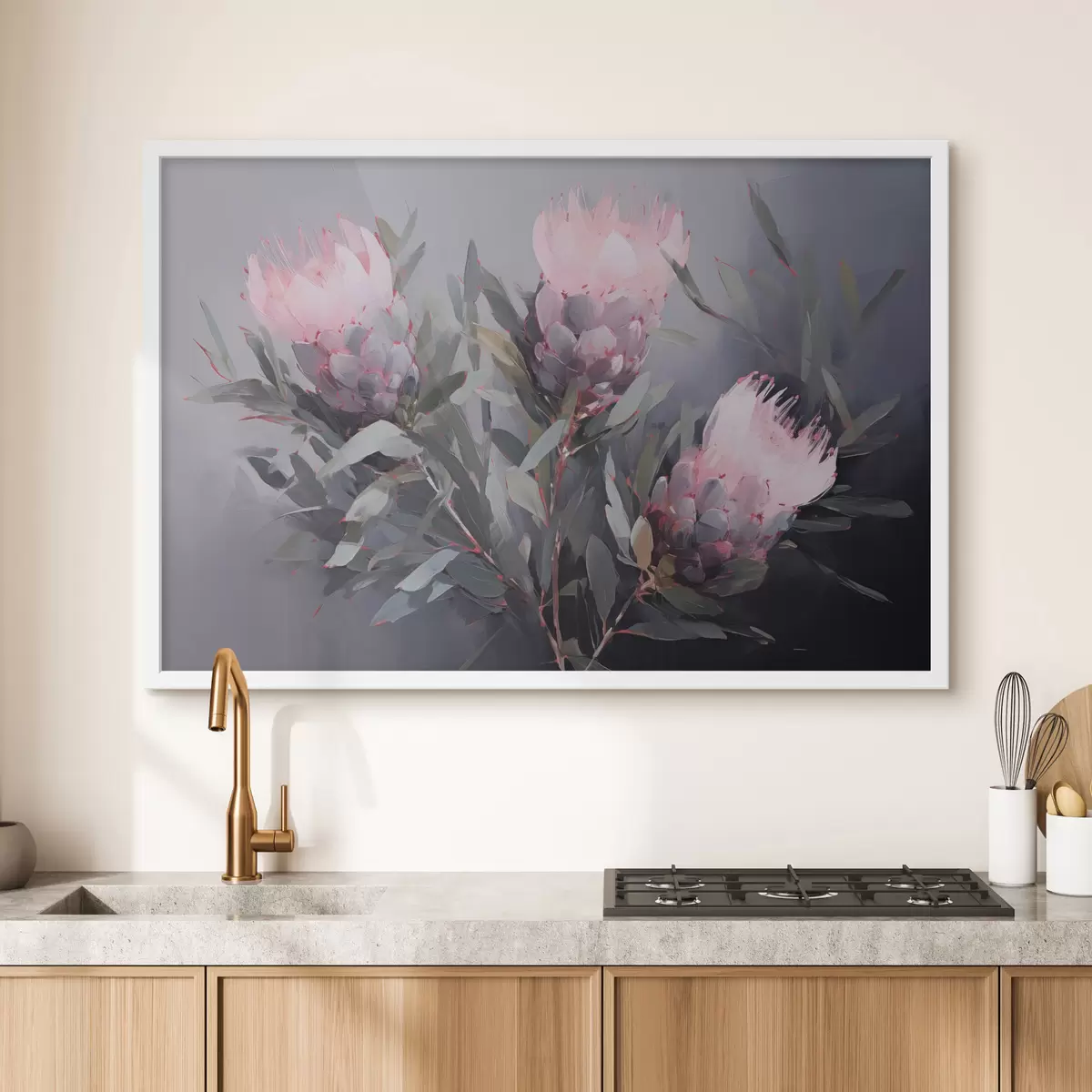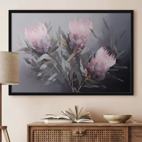 Poster Flores de protea rosa con hojas verdes, pinceladas suaves, colores oscuros, composición elegante Nr f44400