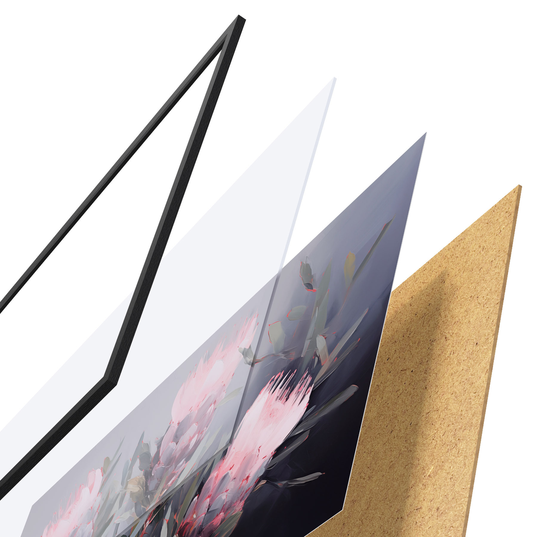 El póster consta de marco, plexiglás, imagen impresa y soporte de aglomerado. El póster puede colgarse inmediatamente en la pared gracias a los soportes de la parte posterior.
